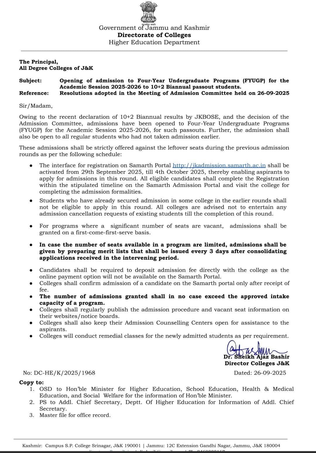 Revised Timeline for Admission for Four Year Under Graduate Semester-1 Programmes for the Academic Session 2025-26.